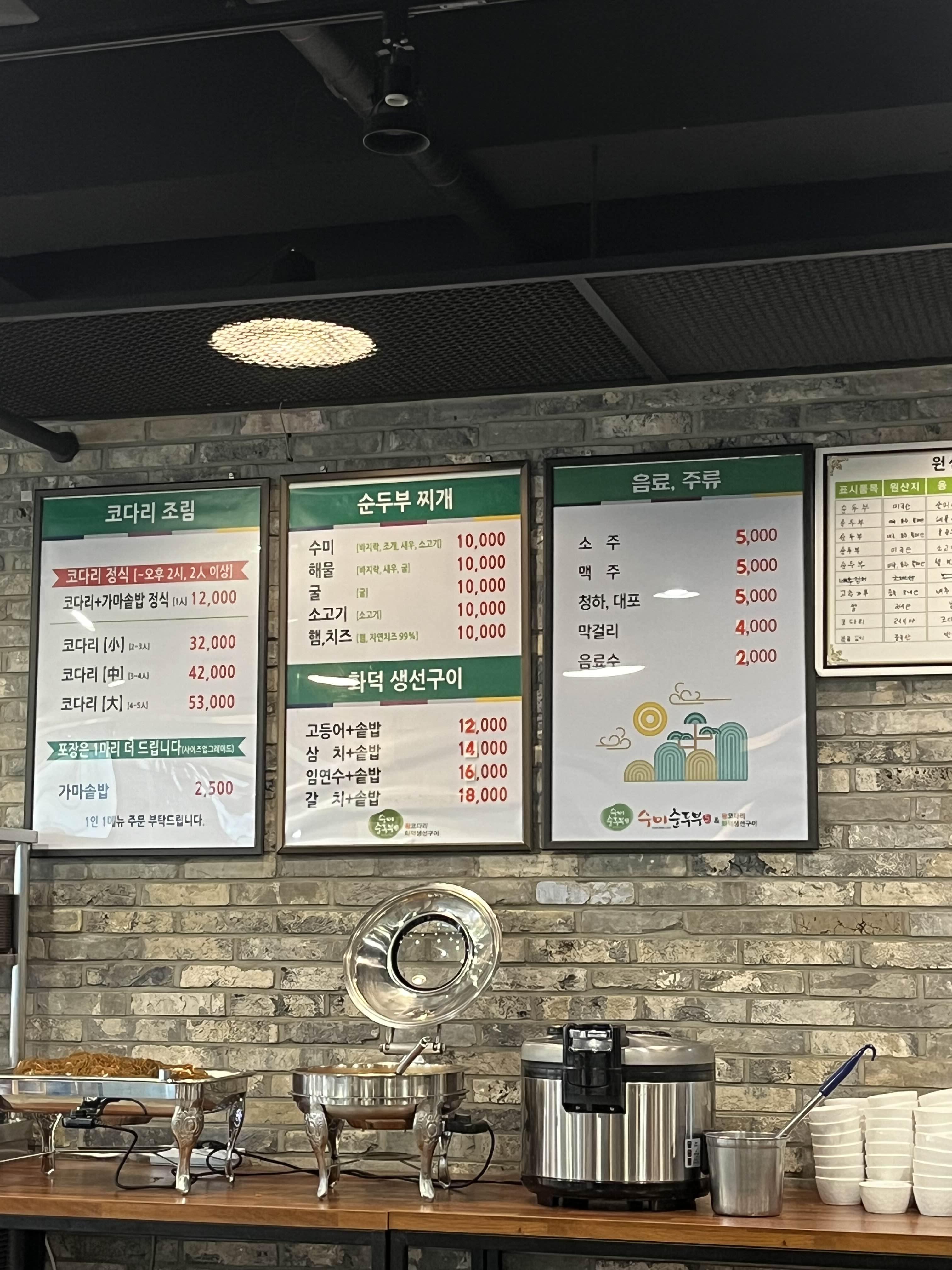 입구에 들어서면 아늑한 분위기와 함께 정갈한 인테리어가 눈에 띕니다. 메뉴판에는 다양한 순두부찌개와 함께 해물, 고기 등의 조합이 소개되어 있어 선택의 폭이 넓습니다. 저는 '수미 순두부찌개'를 주문했는데, 가격도 적당하여 가성비가 뛰어났습니다.