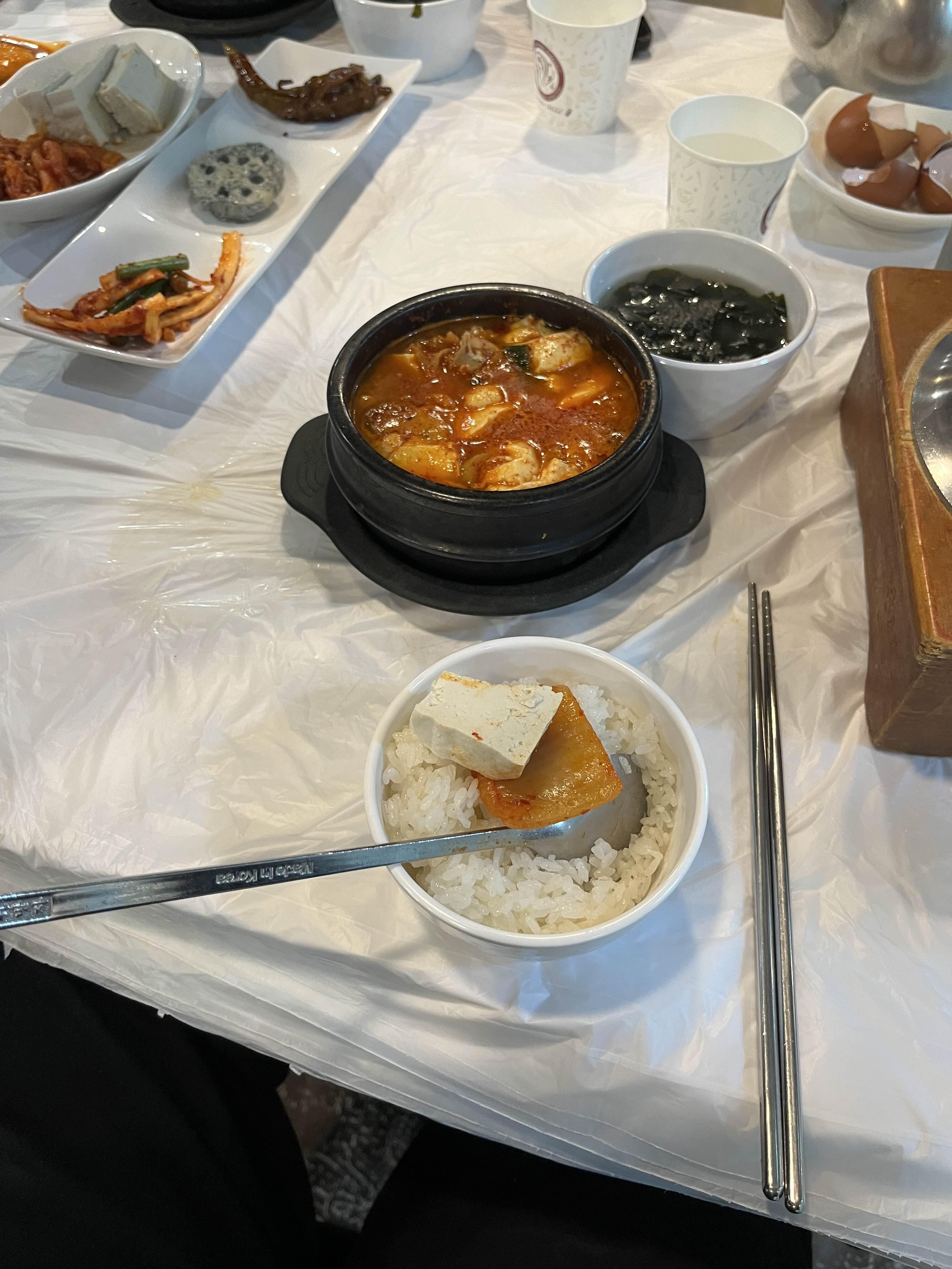 주문 후 얼마 지나지 않아 등장한 찌개는 끓는 상태로 나오며, 그 향이 입맛을 돋구었습니다. 국물은 진하고 얼큰한 느낌이 강했으며, 부드러운 순두부가 푸짐하게 들어 있어 한 숟갈 떠먹는 순간 깊은 풍미가 느껴졌습니다. 특히, 매콤한 양념이 순두부와 잘 어우러져 있어 밥과 함께 먹으면 더욱 맛있었습니다.