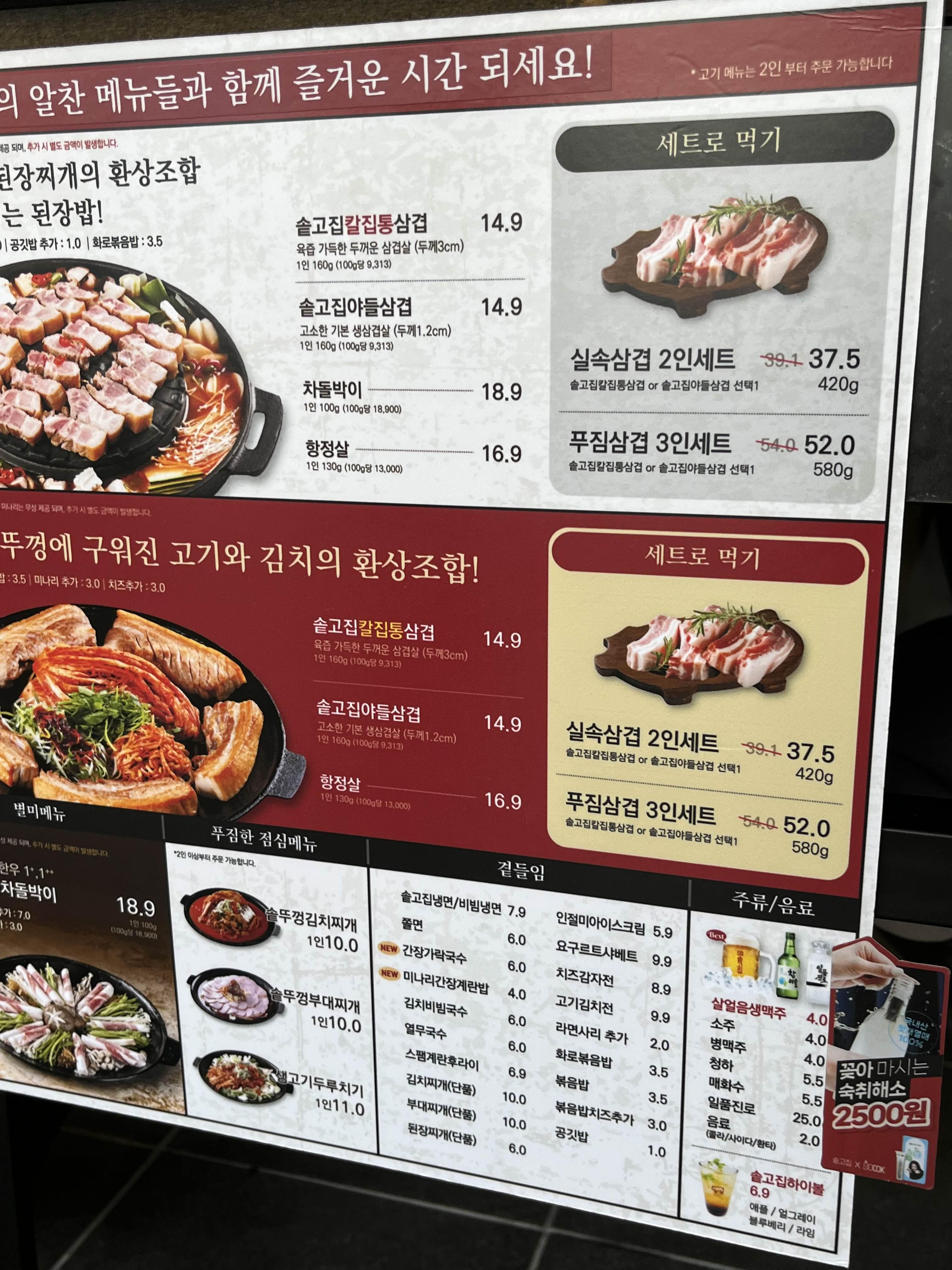 솥고집은 세트 메뉴도 다양하게 제공하여, 여러 사람과 함께 방문해도 부담 없이 즐길 수 있습니다. 예를 들어, ‘실속삼겹살 2인 세트’와 ‘푸짐삼겹살 3인 세트’는 가격 대비 푸짐한 양을 자랑하며, 각종 반찬과 함께 제공되어 더욱 풍성한 식사를 경험할 수 있습니다.