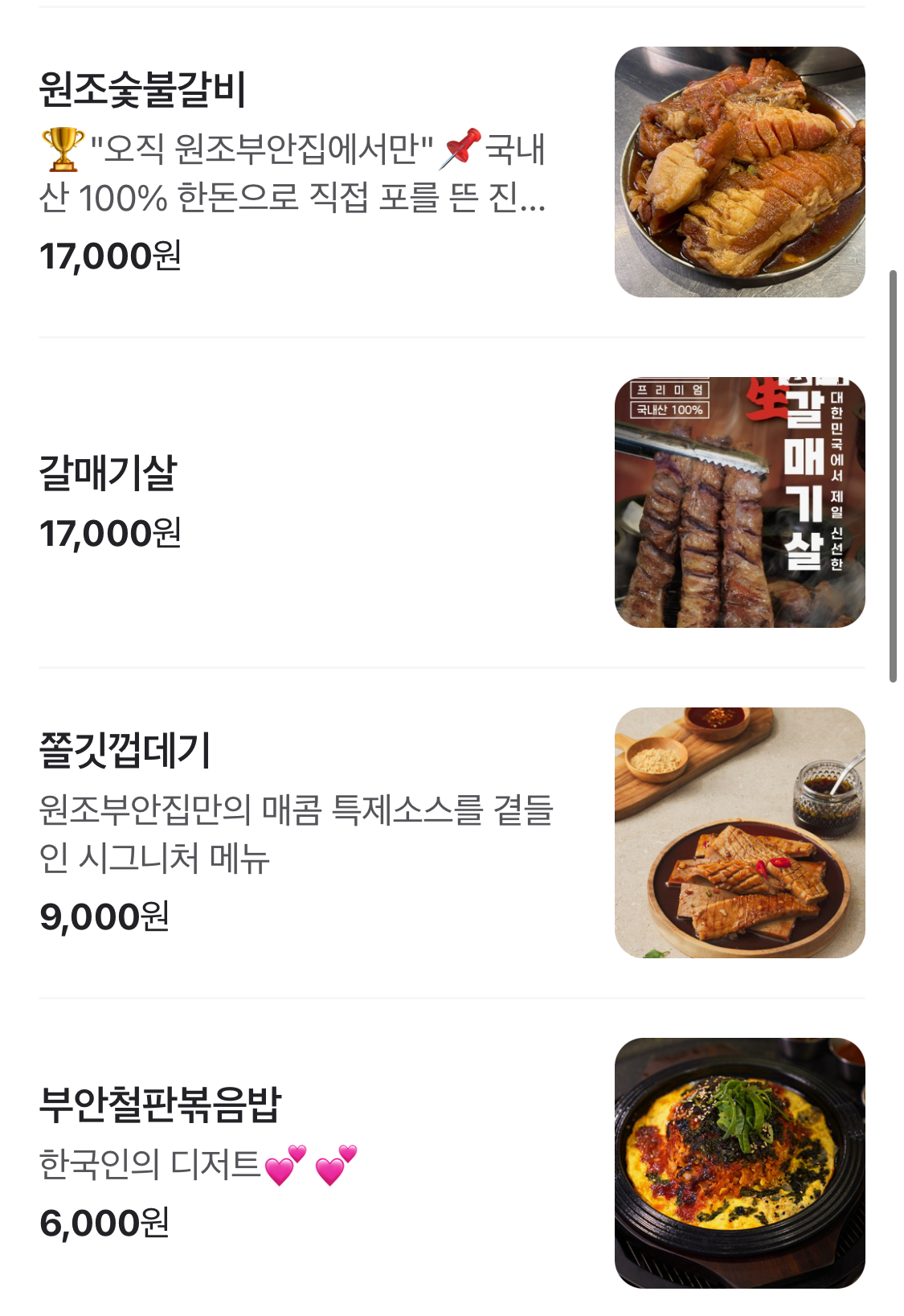 원조부안집의 가장 큰 장점 중 하나는 신선한 재료와 뛰어난 고기 질입니다. 많은 고객들이 "고기 질이 좋아요"라는 리뷰를 남길 정도로, 이곳의 고기는 입에서 살살 녹는 맛을 자랑합니다. 특히, 쫄깃한 식감의 목살과 부드러운 삼겹살은 이곳의 대표 메뉴로, 한번 맛보면 잊을 수 없는 경험이 될 것입니다.