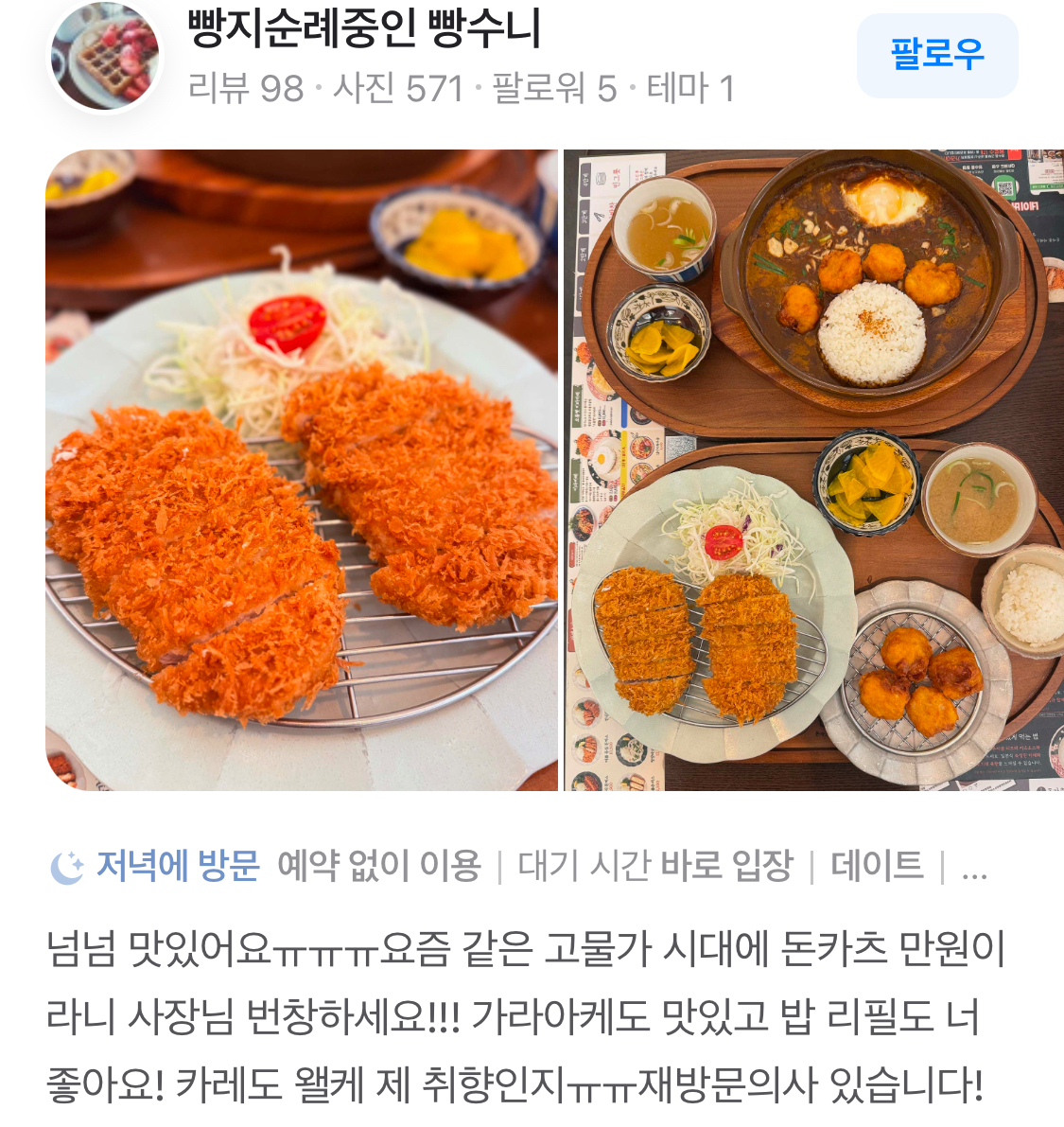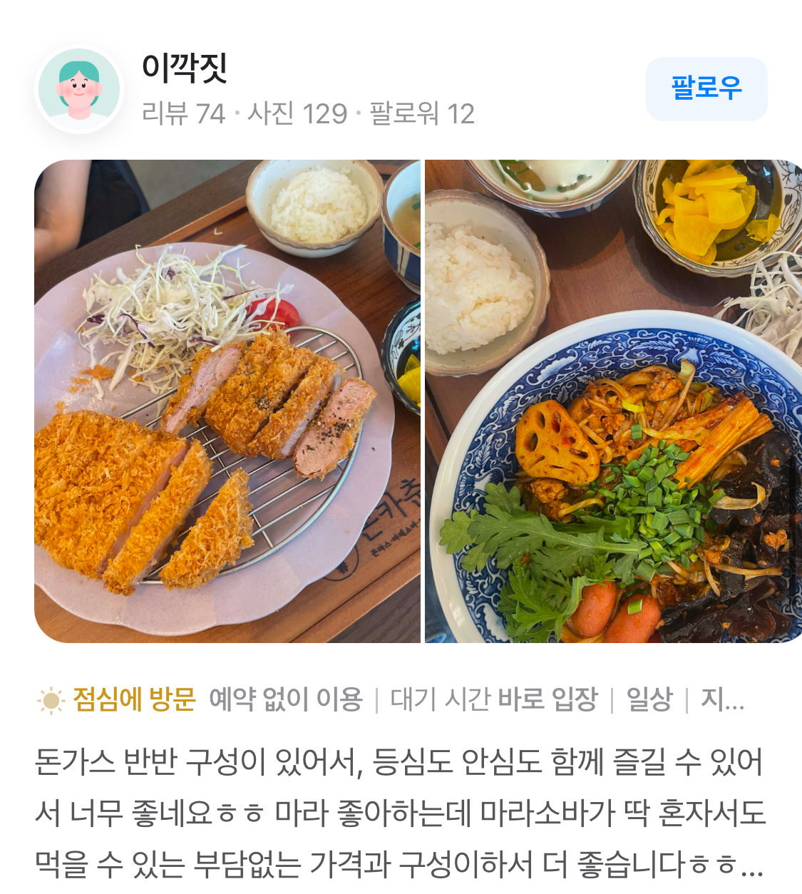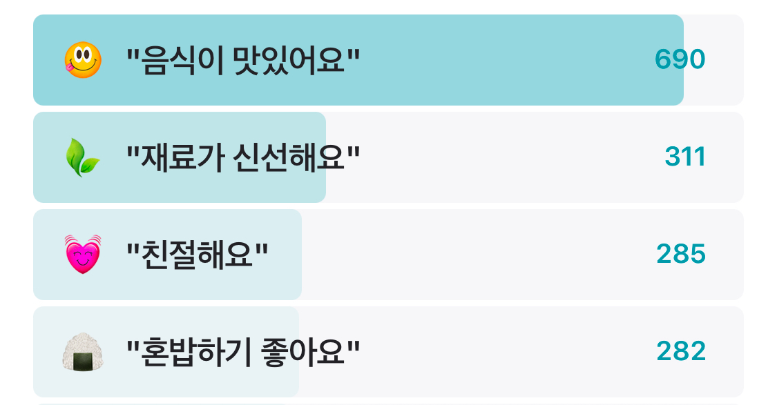 방문객들의 리뷰를 살펴보면, "음식이 맛있어요"라는 평이 가장 많이 보입니다. 많은 사람들이 이곳의 음식 맛에 감탄하며, 재료의 신선함과 친절한 서비스에 대해서도 긍정적인 반응을 보이고 있습니다. 특히, 혼밥하기 좋은 분위기와 다양한 메뉴 덕분에 혼자서도 편안하게 식사를 즐길 수 있습니다.