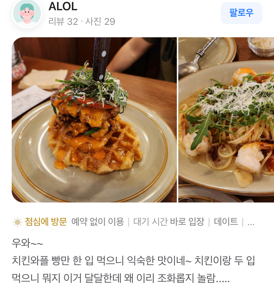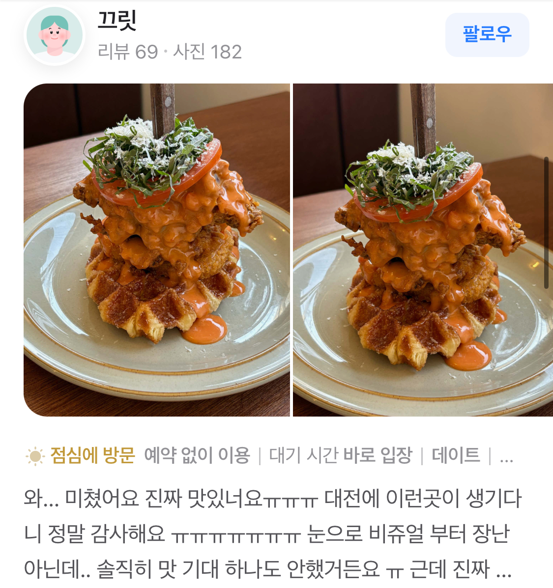 1. 와플 치킨: 바삭한 치킨과 부드러운 와플이 조화를 이루는 메뉴로, 소스가 풍부하게 올라가 있어 한 입 먹으면 감탄이 절로 나옵니다. 많은 리뷰어들이 "음식이 맛있어요"라고 극찬하며, 이 메뉴를 꼭 시켜보라고 추천합니다.