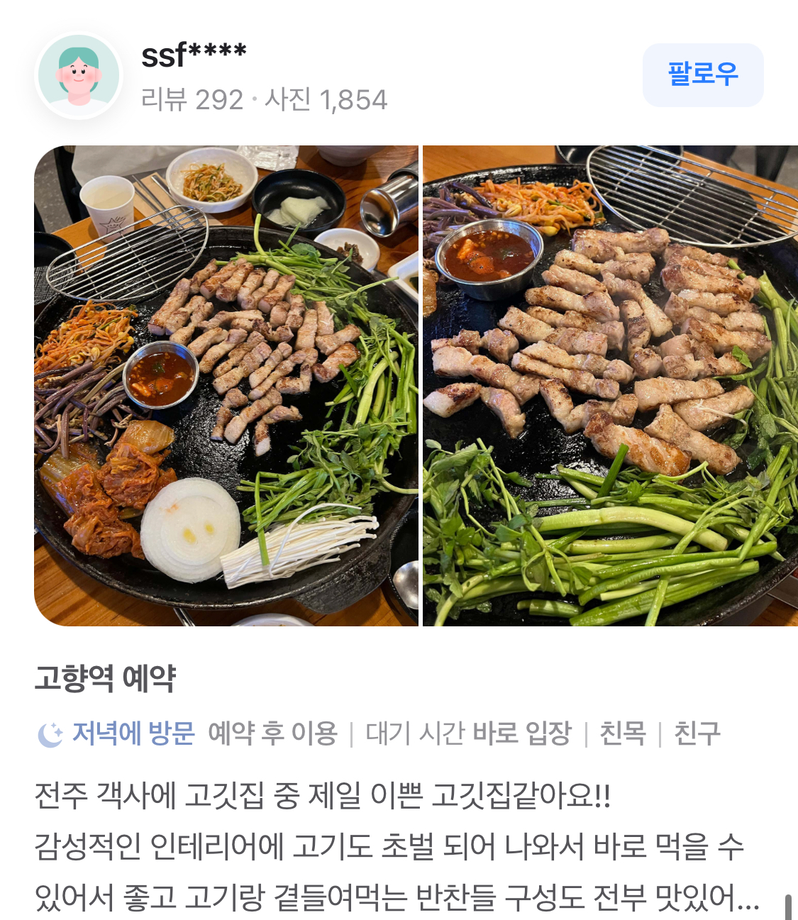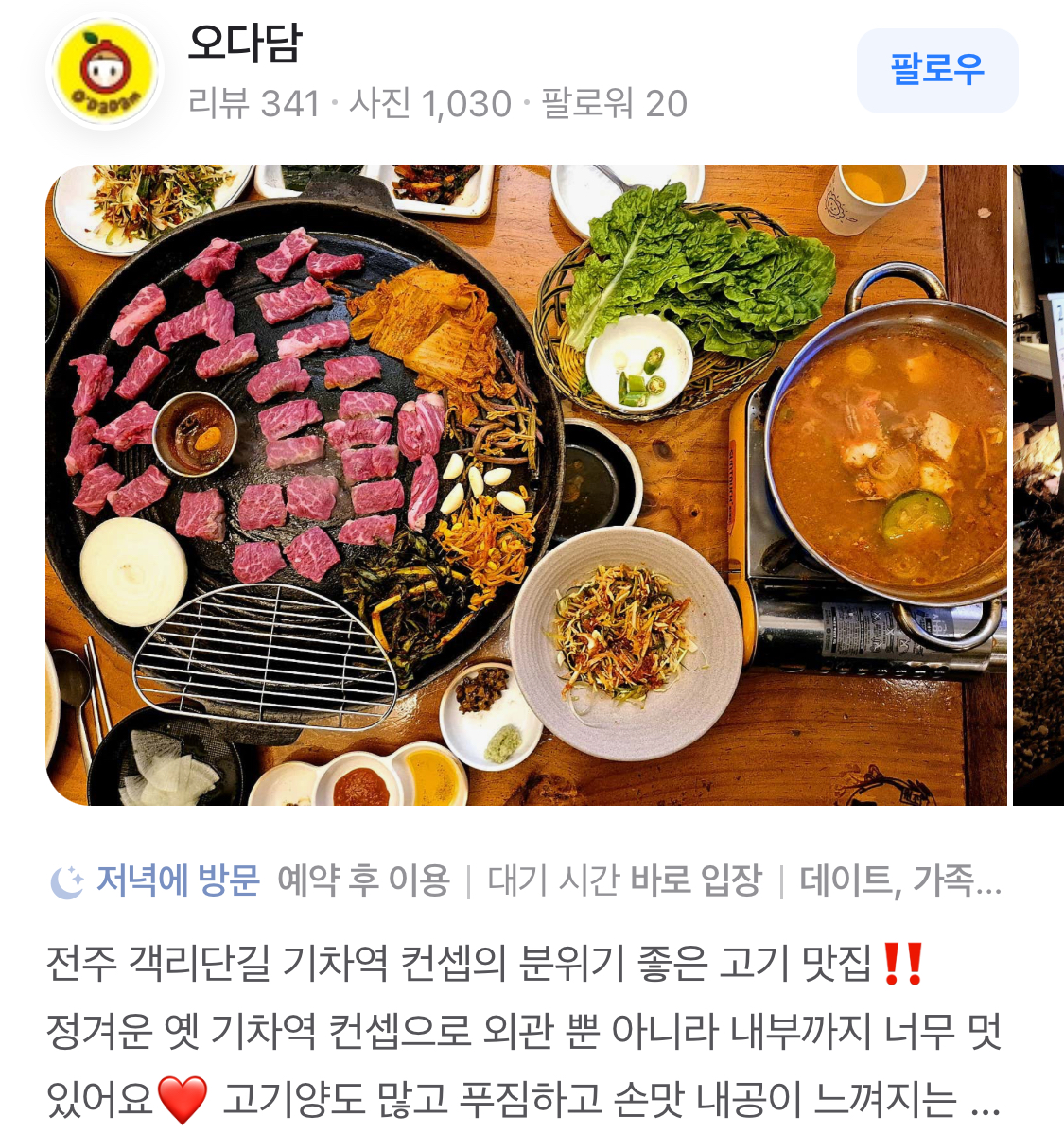 고향역 전주객사본점은 방문자 수가 2,530명에 달하며, 블로그 리뷰는 5,084건에 이릅니다. 이는 많은 사람들이 이곳의 맛과 서비스를 인정하고 있다는 것을 보여줍니다. 특히, 고기 요리를 좋아하는 분들에게는 꼭 추천하고 싶은 장소입니다.