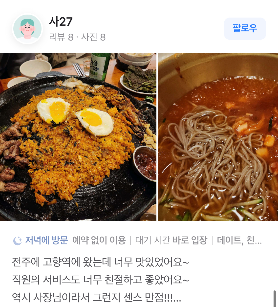 고향역 전주객사본점의 분위기는 아늑하고 편안하여, 친구나 가족과 함께 방문하기에 적합합니다. 내부 인테리어는 깔끔하고 현대적인 느낌을 주며, 편안한 좌석이 마련되어 있어 오랜 시간 앉아 있어도 불편함이 없습니다. 또한, 직원들의 서비스도 매우 친절하여, 방문객들이 편안하게 식사를 즐길 수 있도록 배려하고 있습니다.