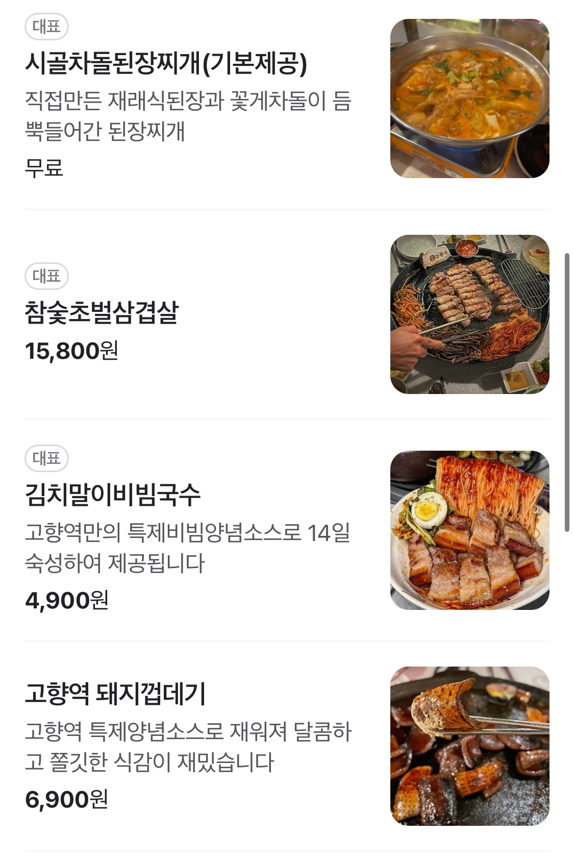이곳의 대표 메뉴는 신선한 고기를 사용한 다양한 요리입니다. 특히, 고기와 함께 제공되는 반찬들은 정갈하고 맛있어, 고기와의 조화가 일품입니다. 고기를 구워 먹는 재미와 함께, 다양한 반찬을 곁들여 먹는 즐거움이 있습니다. 고향역 전주객사본점에서는 고기뿐만 아니라, 신선한 채소와 함께 제공되는 반찬들도 많은 사랑을 받고 있습니다.