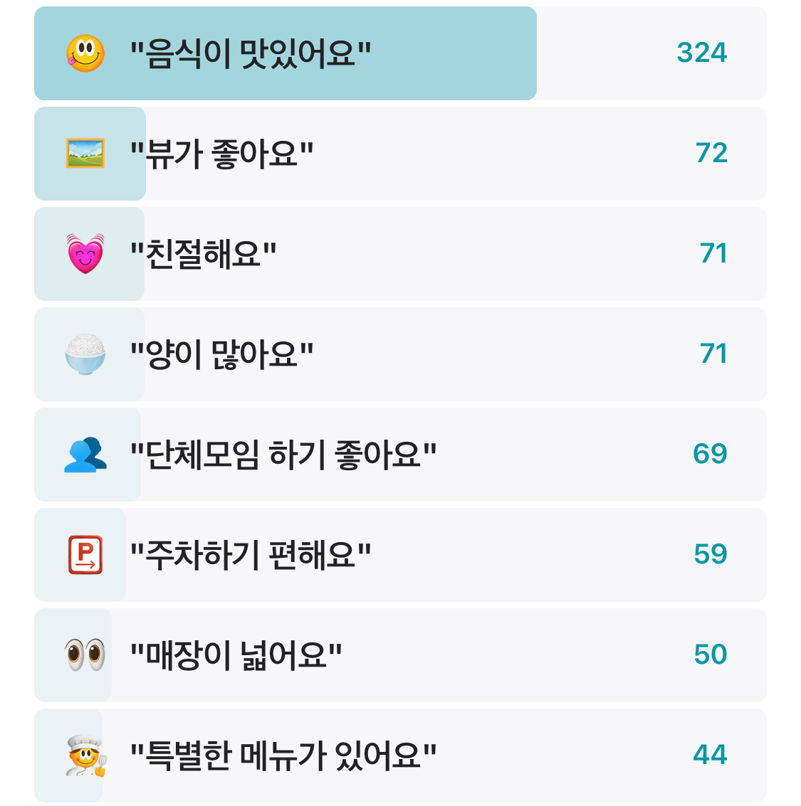 식사량에 대한 만족도도 높습니다. "양이 많아요"라는 리뷰가 71건에 달하며, 이는 고객들이 제공되는 음식의 양에 대해 긍정적인 반응을 보이고 있음을 나타냅니다. 푸짐한 양은 가족 단위 방문객들에게 특히 인기가 있으며, 여러 가지 음식을 나누어 먹기 좋은 환경을 제공합니다.