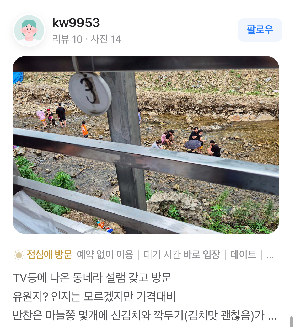 또한, 장수촌은 "뷰가 좋아요"라는 리뷰도 많이 받고 있습니다. 이곳은 자연 경관이 아름다워 식사하는 동안 편안한 분위기를 느낄 수 있습니다. 특히, 강가에 위치해 있어 시원한 바람과 함께 자연을 만끽할 수 있는 점이 매력적입니다. 이러한 환경은 가족이나 친구들과 함께 방문하기에 적합합니다.