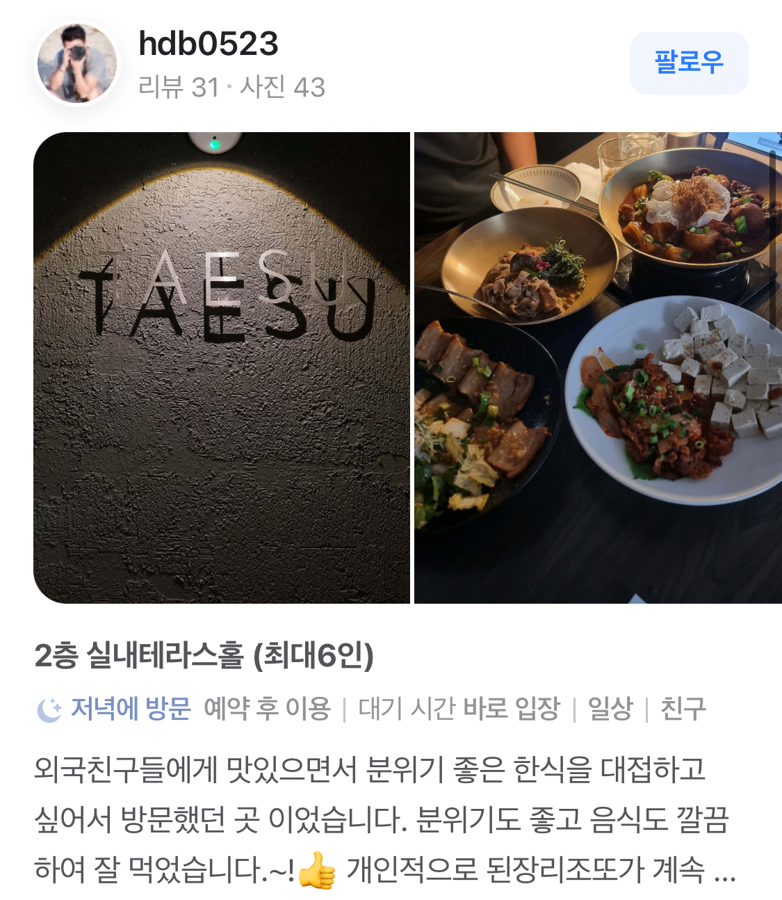 태수를 방문한 고객들은 대체로 긍정적인 후기를 남기고 있습니다. 한 고객은 "외국 친구들과 함께 맛있으면서 분위기 좋은 한식을 대접하고 싶어 방문했다"며, "분위기도 좋고 음식도 깔끔하여 잘 먹었다"고 전했습니다. 이처럼 태수는 다양한 고객층에게 사랑받고 있으며, 그 이유는 맛뿐만 아니라 서비스와 분위기에도 있습니다.