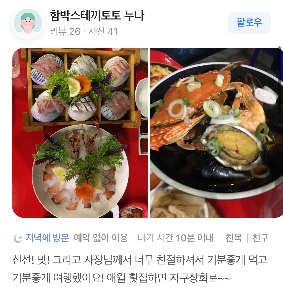 많은 방문객들이 지구상회의 음식과 분위기에 대해 긍정적인 후기를 남기고 있습니다. 한 방문객은 "통창으로 바다가 한눈에 보이면서 기분이 아주 좋았다. 자연산 세트를 시켰는데 완전 푸짐하고 맛있었다!"라고 말했습니다. 또 다른 방문객은 "친절한 사장님과 함께 맛있는 음식을 즐길 수 있어 좋았다."고 전했습니다.