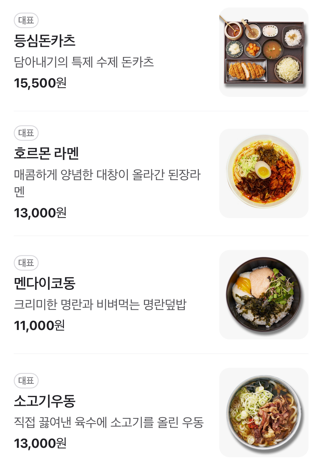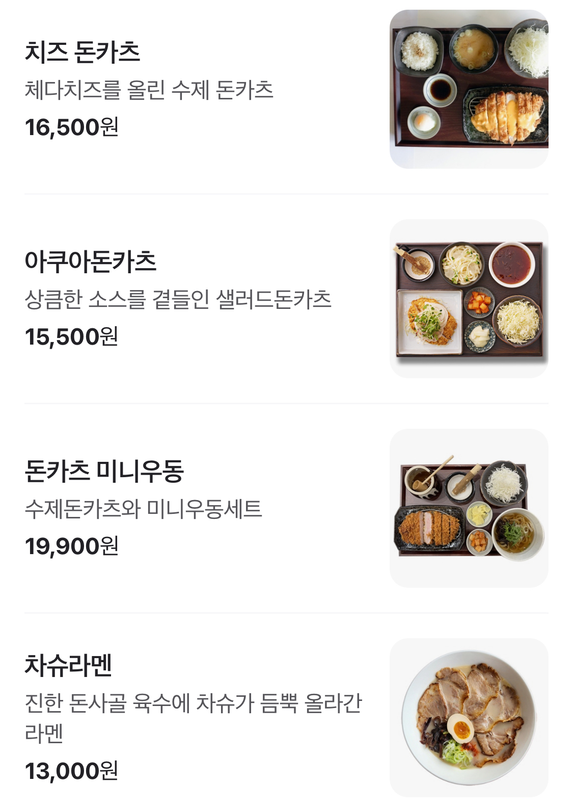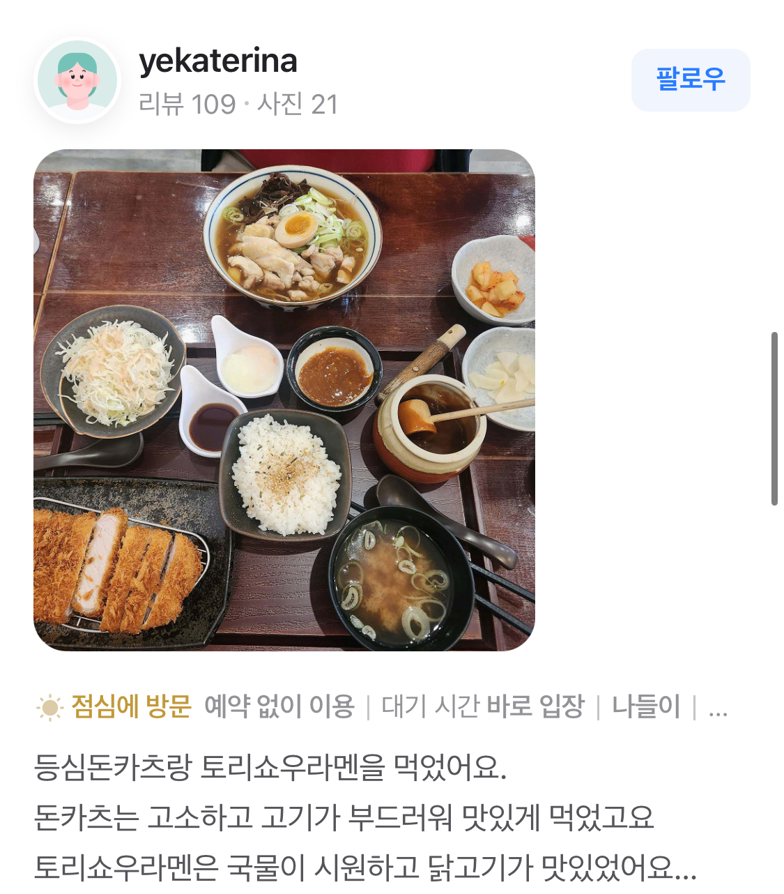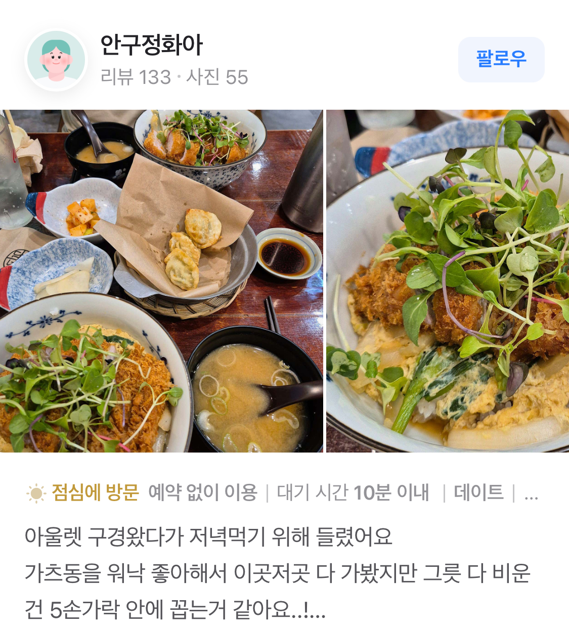 돈카츠는 바삭한 튀김옷과 부드러운 고기가 어우러져, 한 입 베어 물면 고소한 맛이 입안 가득 퍼집니다. 사이드로 제공되는 양배추 샐러드와 소스는 돈카츠의 맛을 더욱 돋보이게 해줍니다. 이 메뉴는 "재료가 신선해요"라는 리뷰를 받을 만큼 신선한 재료로 만들어집니다.