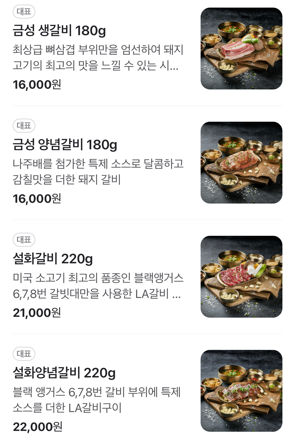 - 금성 양념갈비: 역시 180g 기준으로 16,000원에 제공되며, 달콤하고 짭조름한 양념이 고기에 잘 배어 있어 맛이 뛰어납니다.