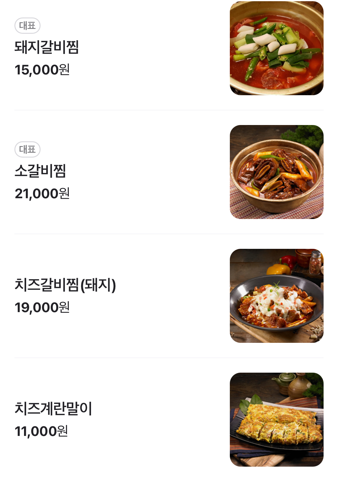 | 매운갈비찜 | 매콤한 양념의 갈비찜 | 15,000원 |