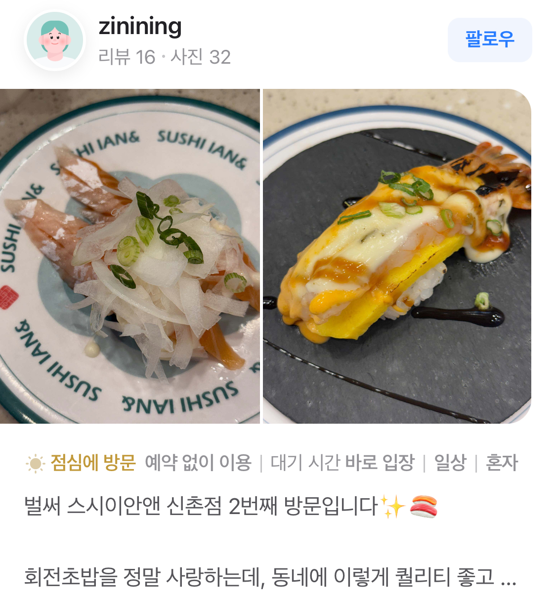 5. 특별한 메뉴: 스시이안 신촌점에서는 계절에 따라 특별한 메뉴도 제공하니, 방문할 때마다 새로운 맛을 경험할 수 있습니다.